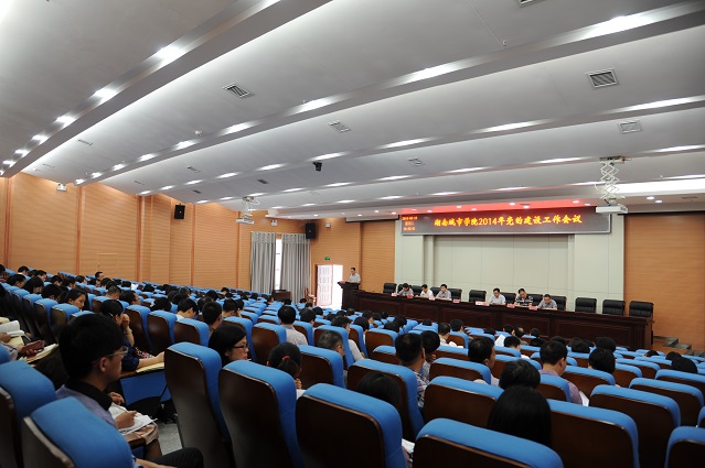 (本网讯)6月10日下午,学校在图书馆报告厅召开2014年党建工作会议。校领导赵运林、李建华、龚卫明、严曙光、丁亮中、郑卫民、曹太康以及全校副处以上干部、各党总支及直属支部委员、学生党支部书记代表等出席。会议由校长李建华主持。