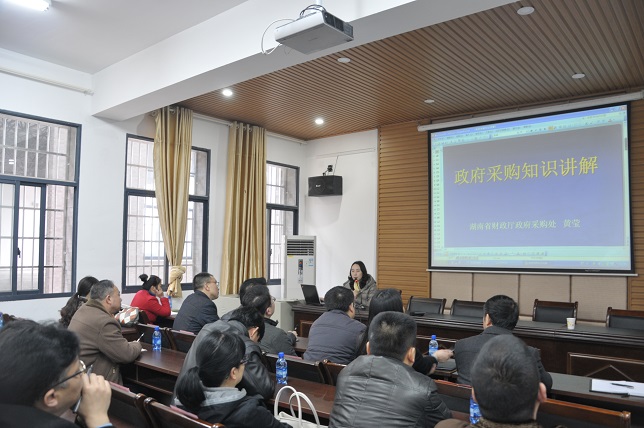 (本网讯)3月20日下午,学校在二办公楼三楼会议室举办政府采购知识专题讲座,特邀湖南省财政厅政府采购处副调研员、高级会计师黄莹讲学。学校招投标委员会成员,二级学院院长、分管资产的副院长、资产管理员,纪委监察处、审计处、计财处、资产处、招投标办公室的全体工作人员,以及各机关处室资产管理员参加。副校长严曙光主持讲座活动。