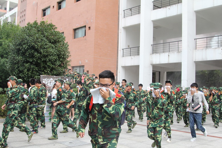 中午12点50,随着模拟烟雾弹在二教学楼升起,疏散演练正式开始。4000名新生在教官的带领下,弯着腰、猫着步,用湿毛巾捂住口鼻,沿着安全疏散标志快速前进,有序撤离到安全地带。