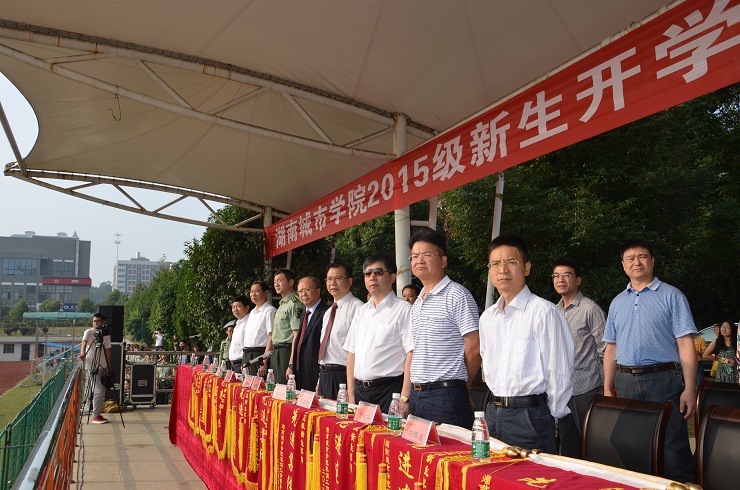 上午,2015级新生开学典礼暨军训汇报表演在田径场隆重举行。经过12天的严格训练后,2015级新生以挺拔俊俏的英姿、刚劲有力的步伐、蓬勃激昂的青春,向学校、老师和家长交上了步入大学后的第一份优秀答卷。校领导李建奇、龚卫明、孟昭武、汤放华、丁亮中、刘辉煌、曹太康,相关处室、二级学院负责人以及新生参加典礼。