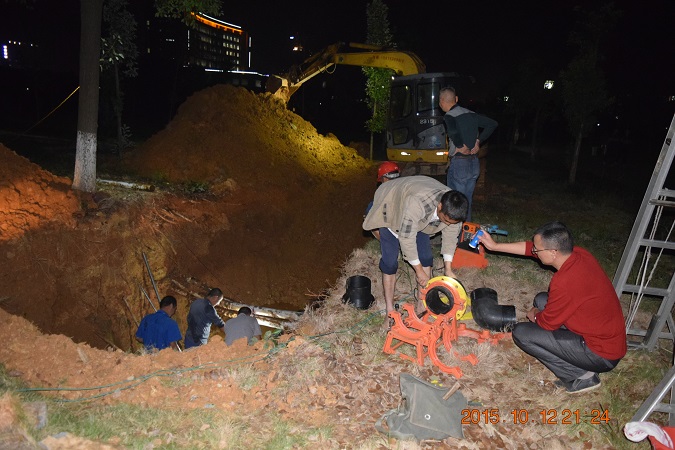 由于地下管道复杂,维修施工难度较大,为了保证新食堂的早餐供应和图书馆的正常供水,后勤处相关维修人员连夜施工,并调来了挖掘机。