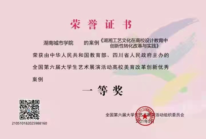 本网讯(通讯员 郑学达)2021年5月12日,由教育部、四川省人民政府共同主办的第六届全国大学生艺术展演活动在成都城市音乐厅落下帷幕,我校美育改革创新案例《湖湘工艺文化在高校设计教育中创新性转化改革与实践----以万搏线上平台为例》荣获一等奖,这是自我校参加全国大艺展活动获得的最高荣誉表彰。
