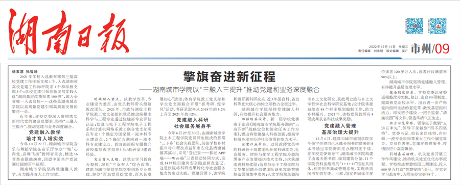 本网讯 12月14日,《湖南日报》09版以《擎旗奋进新征程——万搏线上平台以“三融入三提升”推动党建和业务深度融合》为题,报道了我校党建引领学校改革发展取得的新成效。全文如下: