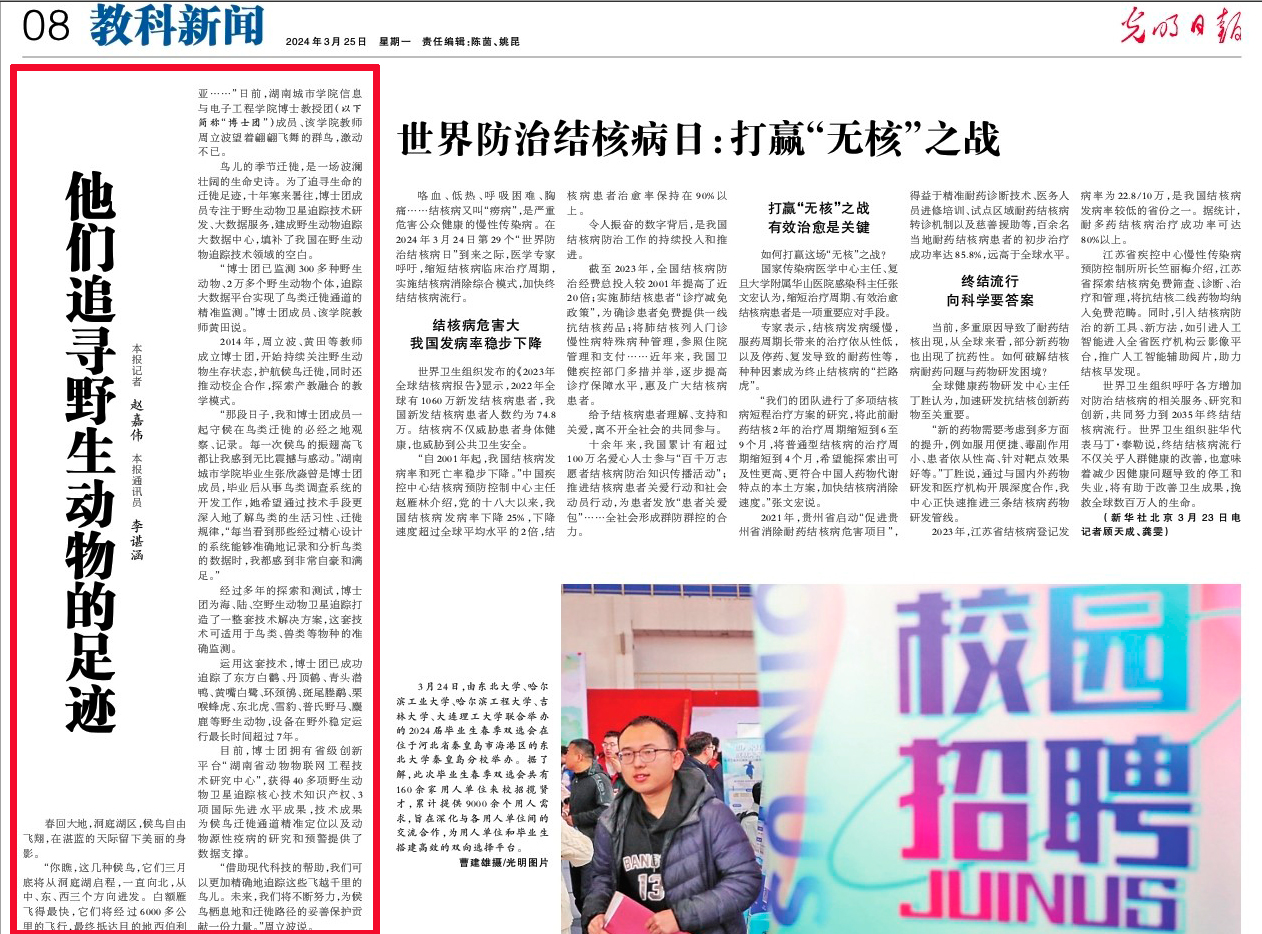 《光明日报》3月25日第8版报道万搏线上平台博士团聚焦野生动物卫星追踪技术研发。