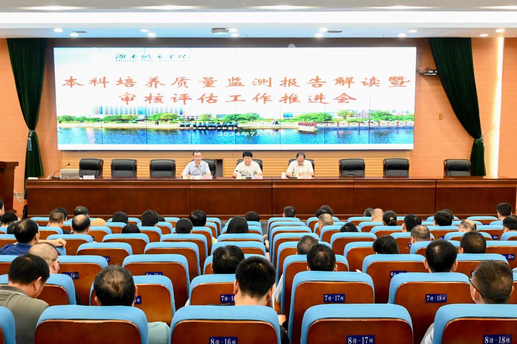 本网讯(通讯员 周术明)7月4日,学校在图书馆报告厅召开本科培养质量监测报告解读暨审核评估工作推进会。党委书记汤放华,校长何振,副校长雷存喜出席会议。汤放华强调,全校师生要铆足干劲、强化担当,以高度的政治责任感和历史使命感积极投身到审核评估工作当中,团结一心、凝聚智慧、全力以赴、奋勇拼搏,确保圆满完成各项工作任务,用满腔的工作热情交一份满意的评估答卷。