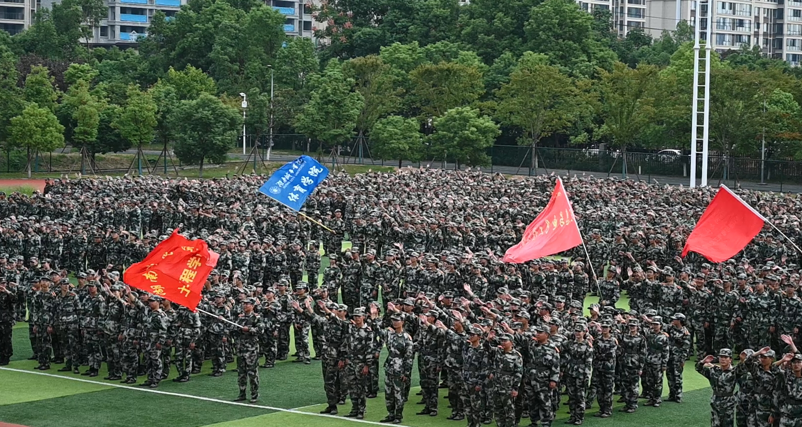 分列式进行曲响彻全场,教官分队持枪入场,眼神坚毅。他们以豪迈的激情斗志、过硬的军事素养向全校师生展现昂扬奋发、勇敢坚毅的精神风貌和青春风采。十四个二级学院方阵紧随其后,身着戎装的新生喊着铿锵有力的口号,迈着整齐矫健的步伐,向全校师生展示军训成果,接受全场的检阅。