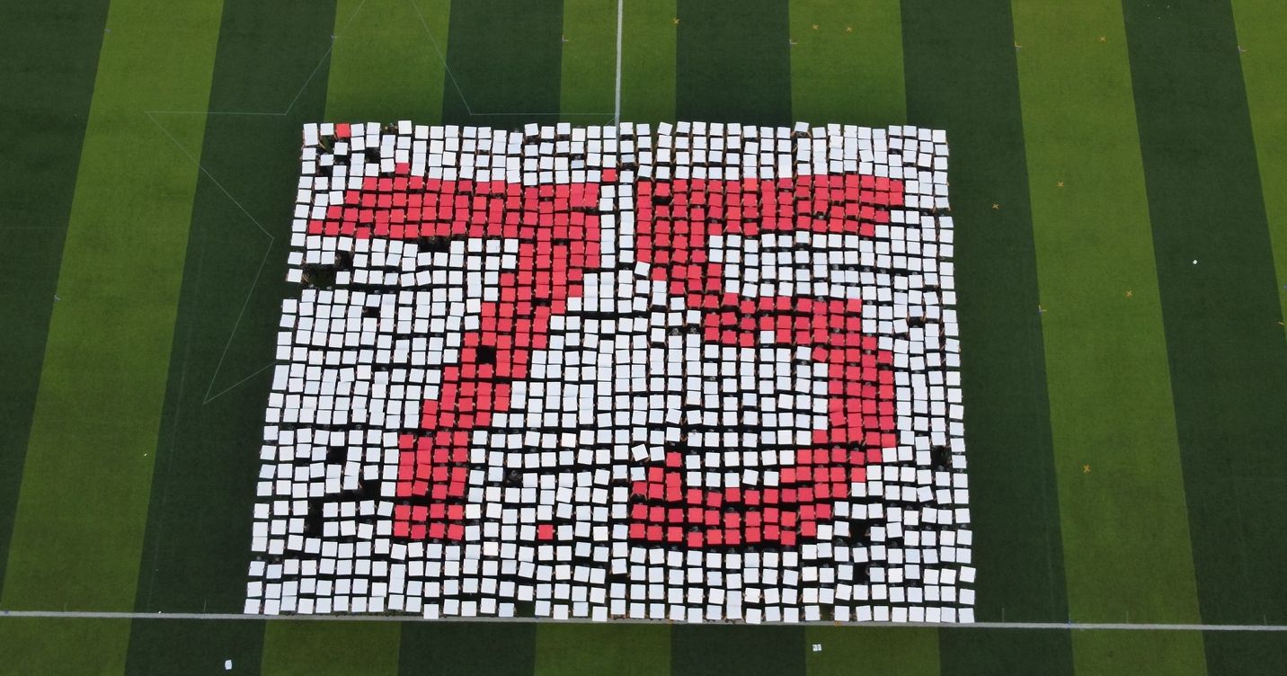 来自各个二级学院的同学们组成的字形方阵成为全场的焦点。他们用手中的红色卡牌拼凑出航母与四架飞机的形状缓缓入场,展现出非凡的默契。在国庆75周年到来之际,新生们用变换的数字和图案,诉说新中国成立前后的奋斗故事,“祝祖国繁荣昌盛、国泰民安”红色与白色的字块默契配合,拼凑出对祖国母亲最真挚的祝福,引得现场热情高涨,掌声经久不息……