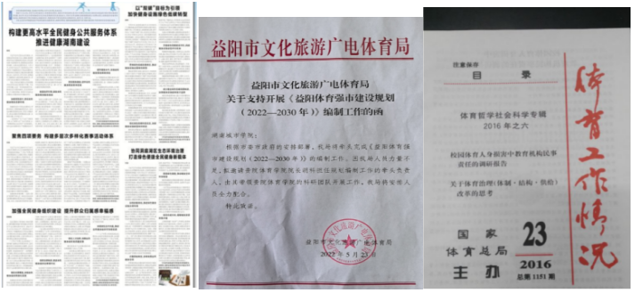 紧紧围绕国家和区域重大战略需求,凝练学科优势,突出科研特色,把科研做在服务国家战略和服务地方发展上,努力打造区域体育事业发展的“智高点”。聚焦益阳市体育现代化评估、国家运动健康城市创建,全民健身政策制定评估、体育服务综合体打造等体育行业发展重大需求,突出体育智库建设,提高决策咨询能力,全面服务地方体育事业发展。先后承担了《益阳市文化旅游广电体育“十四五”发展规划》《益阳体育强市建设规划 (2022-2030年)》等政策的研制工作,依托湖南省乡村体育教育研究基地、湖南省普通高等学校哲学社会科学重点研究基地——社区体育文化研究基地,积极建言献策,在湖南日报智库发表论文20余篇,其中胡科教授撰写的政策咨询报告《体制转型·结构问题·供给变革——关于体育治理改革的思考》《实践取向与推进模式:基层体育组织建设的战略思考》入选国家体育总局内刊《体育工作情况》,为国家体育总局政策制定、决策服务,为地方体育发展提供智力支撑。