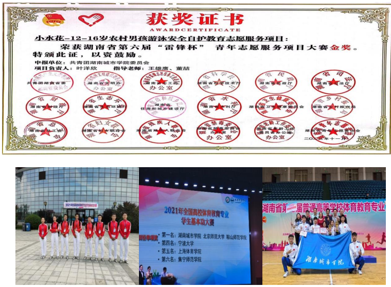 积极组织学生参加各级各类重要赛事,以赛促教检验本科培养质量。近三年,指导学生参与省级以上比赛,获得国家级一、二、三等奖5项,省级一等奖166项,省级二等奖200项,省级三等奖68项。其中2021年全国体育教育专业学生基本功大赛获得团体总分(第五名)、运动技能类团体(第四名)两个二等奖、基础理论知识与教学技能类团体(第八名)三等奖,专业基础理论综合第六名,田径和跳绳两个单项第一名的优异成绩;2023年全省第七届体育教育专业学生基本功大赛中获得了团体总分三等奖、运动技能竞赛团体一等奖,单项:篮球第一名、体操和田径第三名的优异成绩;培养一级运动员9名,二级运动员11名。引导学生在学术研究、学术竞赛中树立家国情怀,培养正确价值观,如大学生“挑战杯”获省级三等奖,“雷锋杯”青年志愿服务大赛获金奖,2024年在第十七届国际先进机器人及仿真技术大赛中荣获体育与运动仿真组二等奖,获国家级大学生创新创业项目7项,全国大学生体育产业创新创业大赛“网球教学手杖”等作品荣获三等奖3项。