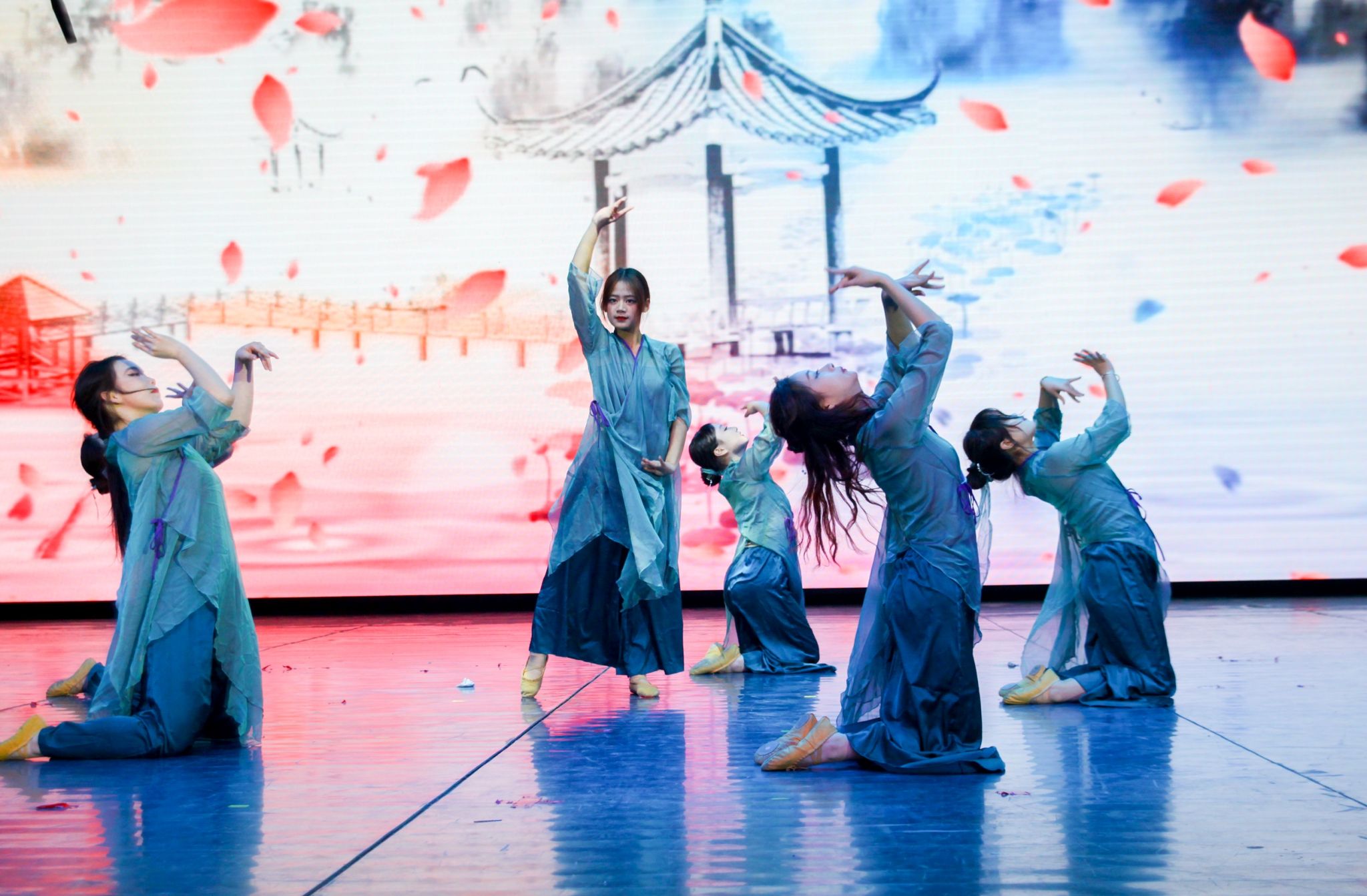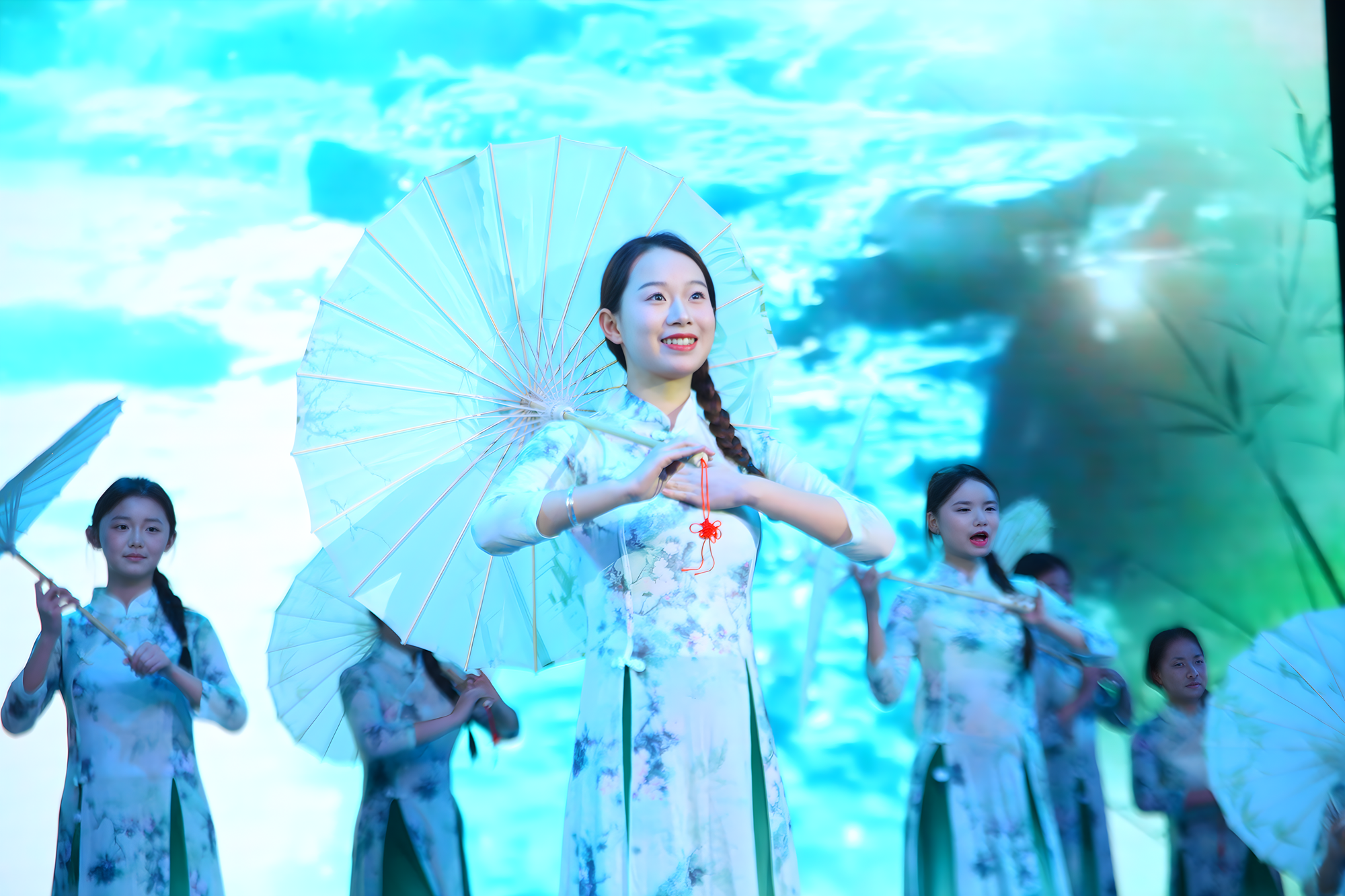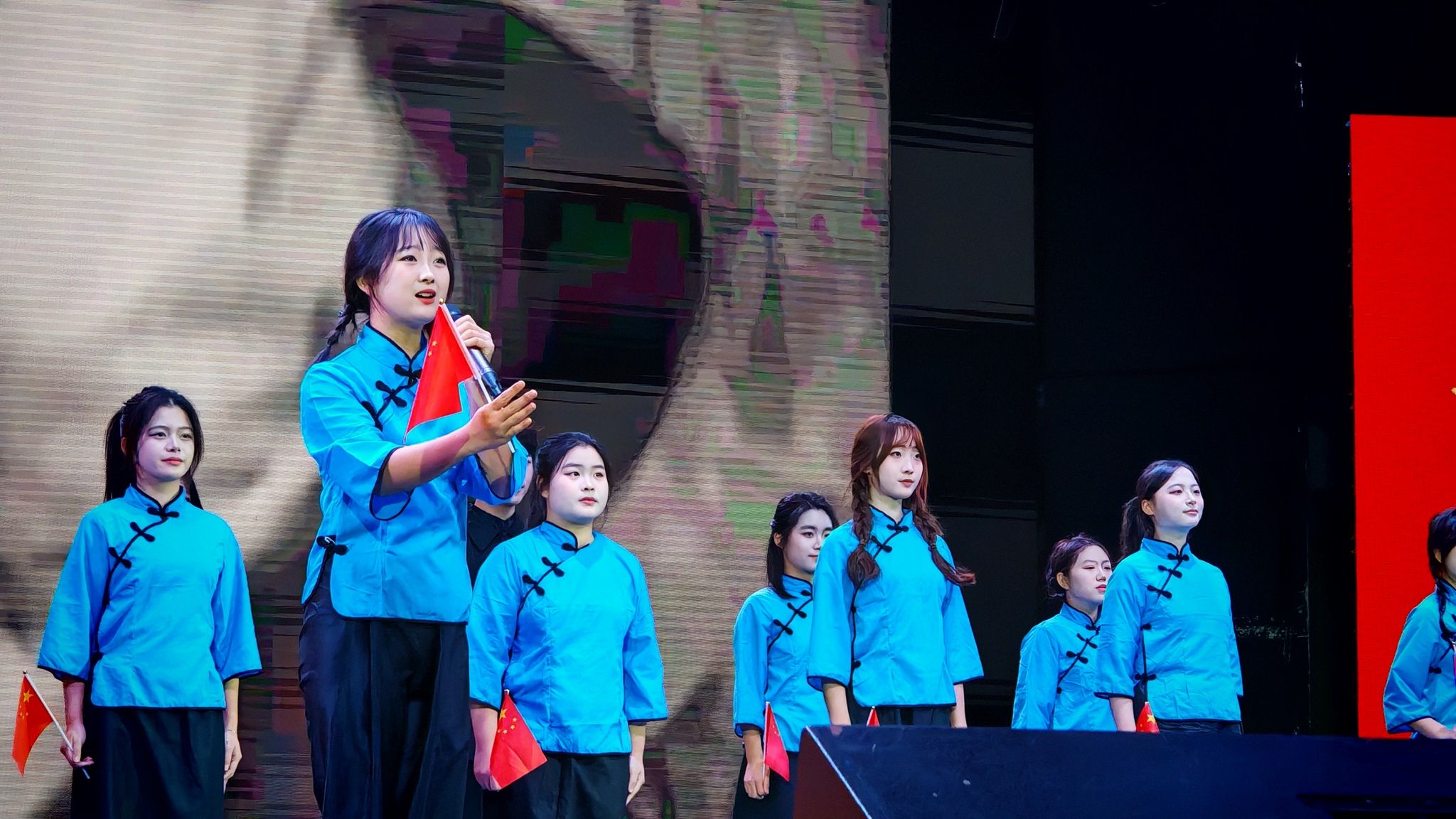 伴随着全场挥舞的校旗,大学生艺术团带来的歌曲《未来我来》展示出城院学子们积极向上的心态、勇于担当的精神、团结合作的力量和青春洋溢的风采;音诗画《山河无恙》,带领现场观众回到那个波澜壮阔的时代,去感受先辈们的热血与激情;在国风舞蹈《采薇》中,舞者们身着飘逸的汉服,在台上舞动,将观众带入了一个诗情画意的世界,穿越古今;朗诵《英雄》抑扬顿挫、跌宕起伏,讲述着无数英雄的故事,真切表达学子们拳拳爱国之心。副校长徐姝携手外籍教师孙娜一同演绎了歌曲《花火》,优美的旋律与动人的唱腔相得益彰,传达了希望与梦想的力量,她们的表演充满了真挚的情感,打动了在场的每一位观众。
