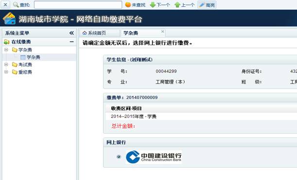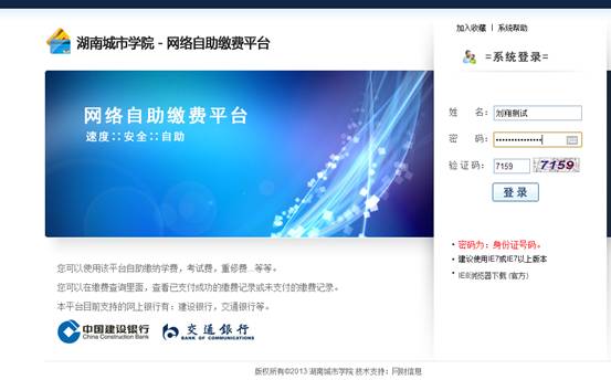 注:根据学校与银行的协议,我校学生在自助缴费系统中将按一定比率分配至建设银行与交通银行,同时为保证每个学生现有的银行卡都可以使用该系统,“支付确定页面”除了出现“建设银行”或者“交通银行”网上支付图标外,还设置了其他银行的图标(近期内将扩展到几个主要银行),持有其他银行卡的同学也可选择进行支付,所有网上银行支付发生的跨行手续费,都不会由学生承担。目前本系统暂不支持信用卡支付。