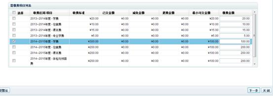 5. 选择缴费内容后,在页面正中将出现详细的缴费信息,除老生缴纳学费、住宿费可自行填报缴费金额外(但需超过最小可交金额),其他收费项目,如重修费、考试费,必须按照收费标准全额缴款;新生第一次缴纳学杂费必须一次性交清全部项目,如不能全部交清请暂不缴费,到校后通过必要手续申请缓交后再缴纳剩余部分。