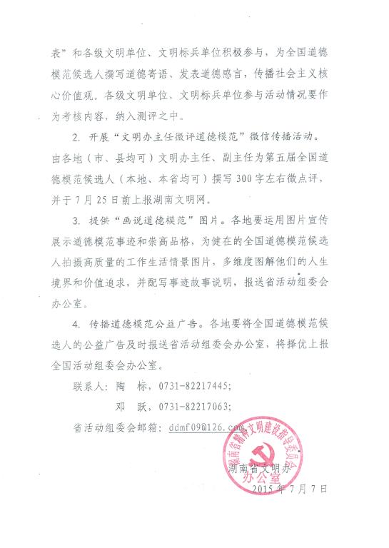 为充分发挥网络新媒体优势,扩大道德模范社会影响,第五届全国道德模范候选人在中国文明网(http://www.wenming.cn/)等相关网站进行集中公示宣传,并开展“点赞道德模范”活动。现将省文明办《关于做好“点赞道德模范”几个事项的通知》转发给你们,请认真贯彻执行。