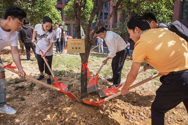 万搏线上平台党委书记罗成翼(左三)与毕业生一同栽树。