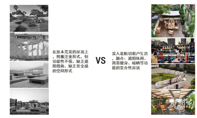屋顶公共空间手段——打造贴近住户生活,且不失趣味的空间。置入框架限定空间,带来一定包裹感。同时框架还能供租户晾晒及简易健身。再置入垂下及收纳卷置框架的帷幕,可围合出小组团空间,亦可形成全开敞空间。