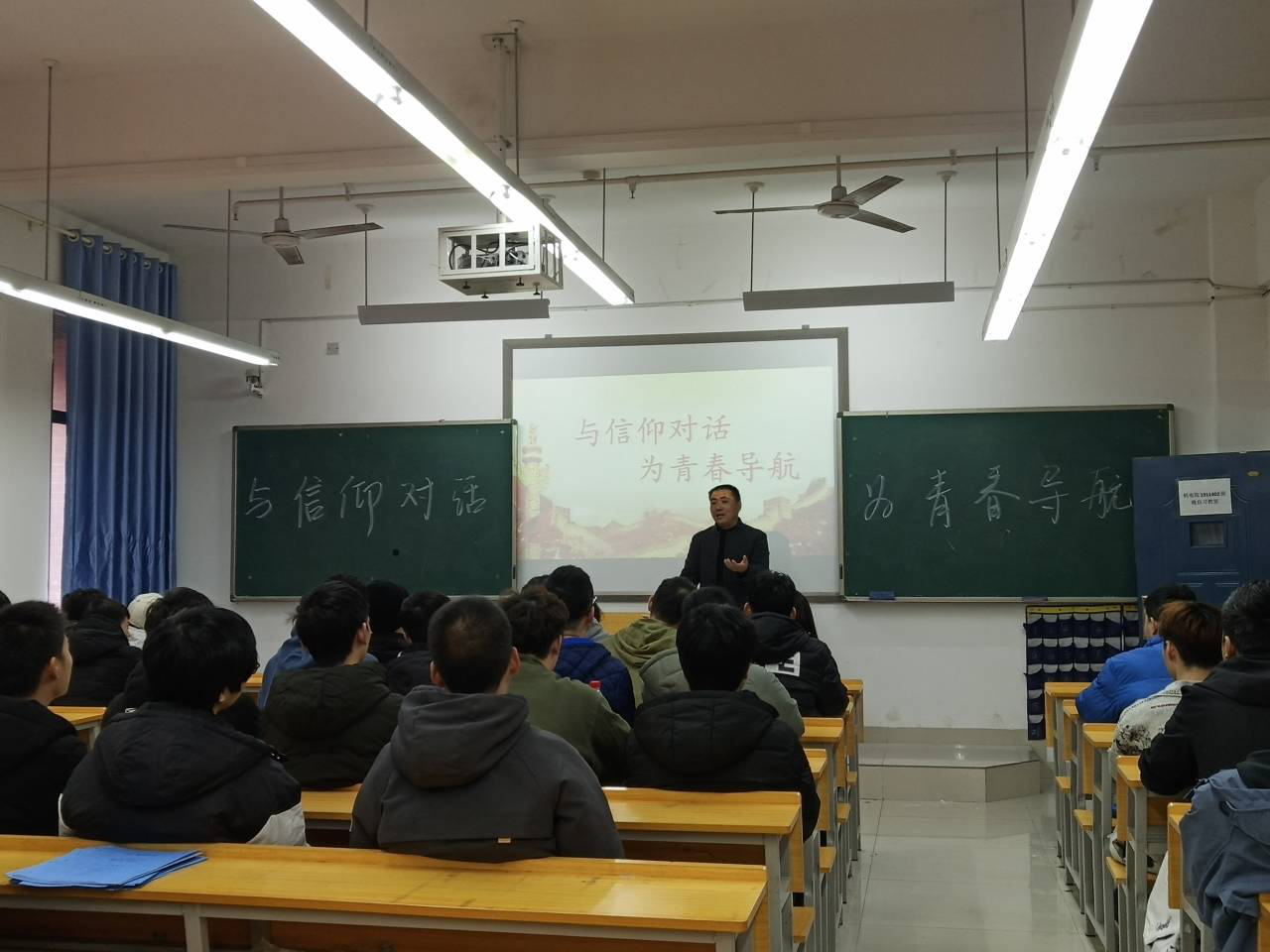 阳同光院长还与同学们进行了深度交流,回答了学生提出的“我们当代大学生要如何把握习近平新时代中国特色社会主义思想中的新思想?新思想新在什么地方,何为新?新思想怎么落实到具体行动中?”等一系列问题,座谈气氛活跃,同学们提问、发言积极,承青春力量,与信仰对话,为青春导航,同学们表示将坚定信仰,不负青春韶华,创造精彩未来。