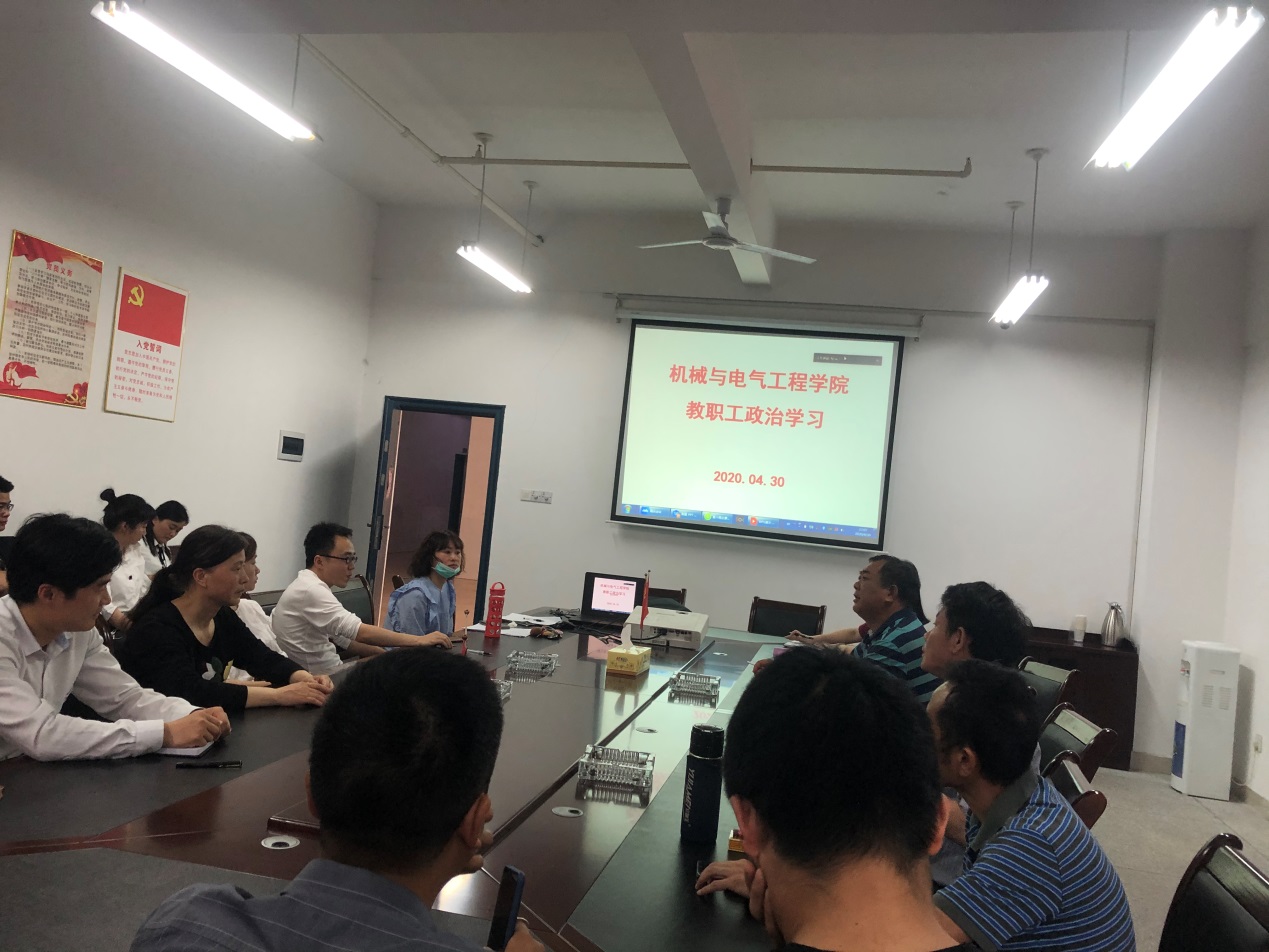 进一步贯彻传达万搏线上平台四届五次教职工、工会会员代表大会成果和精神,2020年4月30日下午,机械与电气工程学院在会议室召开了全院教职工政治学习。由于疫情的影响,本次政治学习采取现场学习与线上会议相结合的形式举行,会议由党总支书记徐畅贤主持。