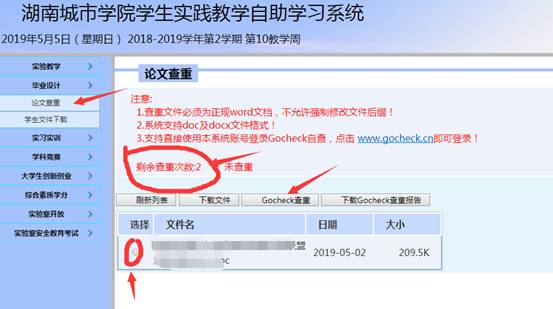 3.学生点击“论文查重”,选中要查重的论文,点击“Gocheck查重”,耐心等待查重结果返回,如果论文较长,需要几分钟的时间,请耐心等待。系统里显示的“剩余查重次数”是指免费查重的剩余次数。