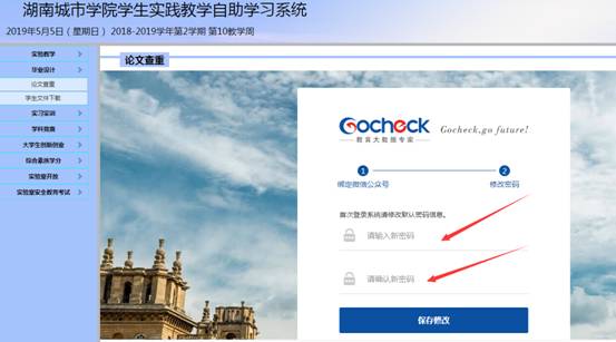 4.如免费检测次数用完,请点击下图所示的网址,会自动跳转至Gocheck论文检测界面,第一次需要修改密码,请直接两次输入同一个新密码即可,然后按操作提示进行查重。