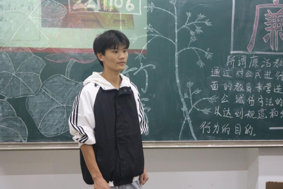 “礼义廉耻,国之四维,四维不张,国乃灭亡”。此次“一院一品”学生廉洁教育主题班会活动的举行,重点是呼吁同学们要敬廉崇俭,反腐治奢,增强反腐意识,做廉洁大学生,学习二十大,奋进新征程。让同学们在日常生活中养成不损公利己,不铺张浪费;平时自觉遵守国家法律法规和党纪党规;自觉遵守《学生手册》和学校规章制度、管理标准;自觉遵守职业道德、社会公德、家庭美德等良好习惯。相信在机电院团委的大力弘扬下,敬廉崇俭一定会在机电院蔚然成风。