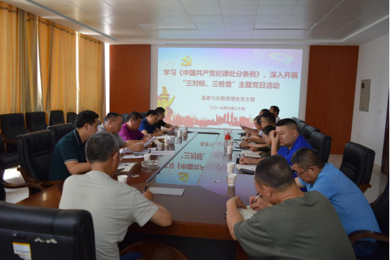 2019年6月20日下午,基建与后勤管理处党支部开展了学习《中国共产党纪律处分条例》深入开展“三对标 三检查”的主题党日活动。全处党员和入党积极分子共同参加活动,活动由支部书记杨少清主持。